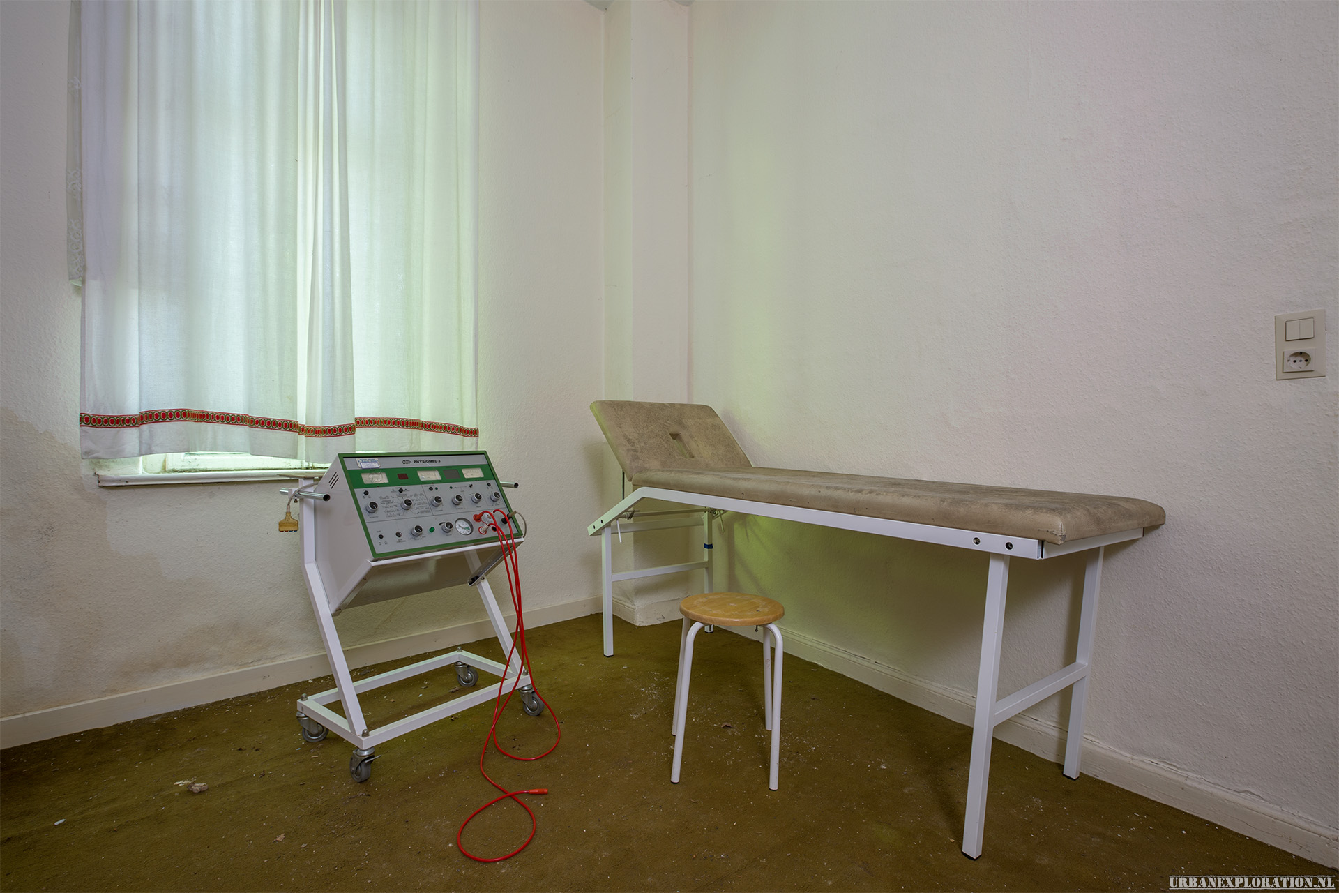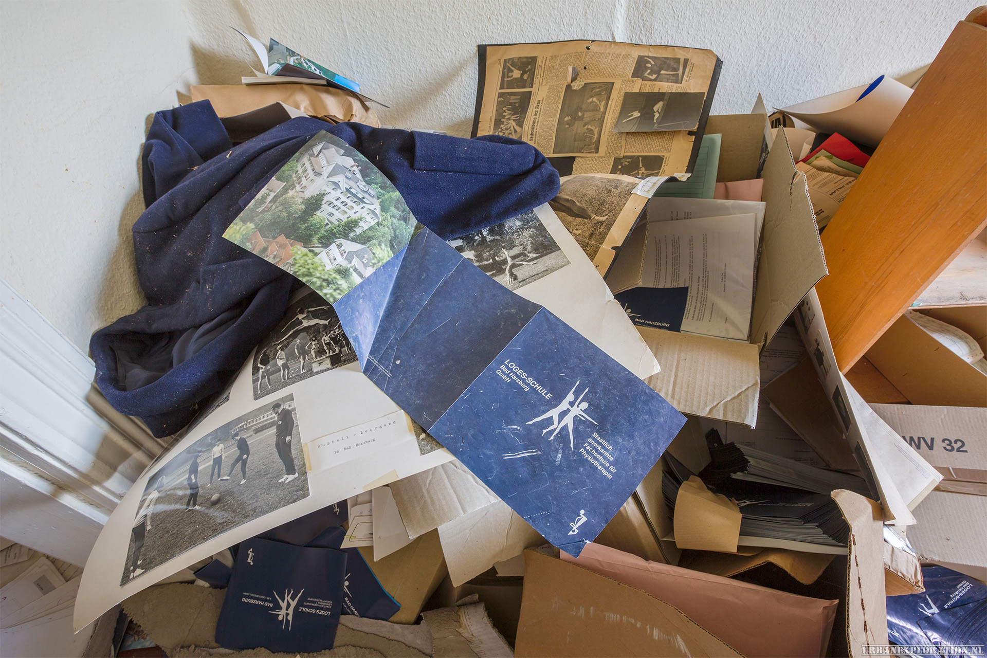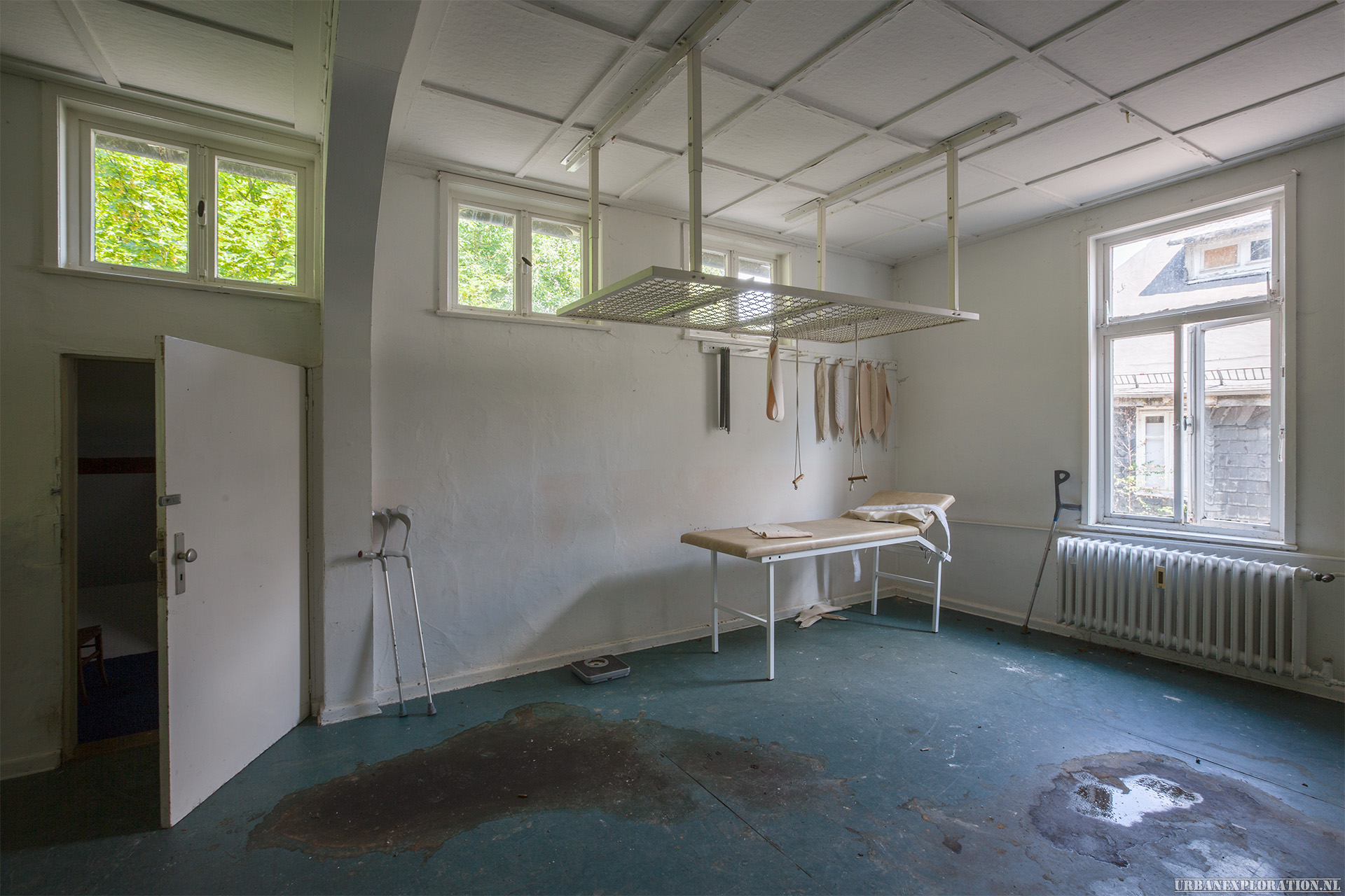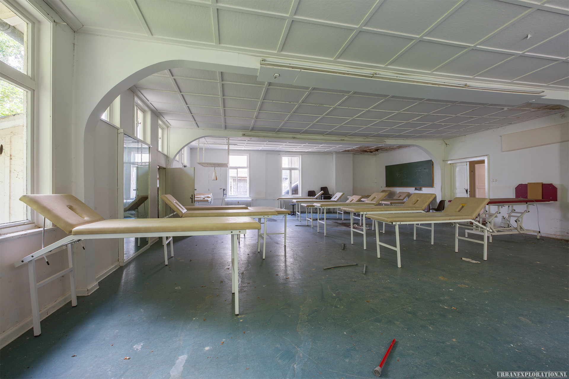 This is the Old University for Physiotherapy. The building got abandoned when the school moved to a more modern accommodation. The lack of maintenance, and a leaking roof made this school a dangerous place to visit. The wooden floors are rotten.