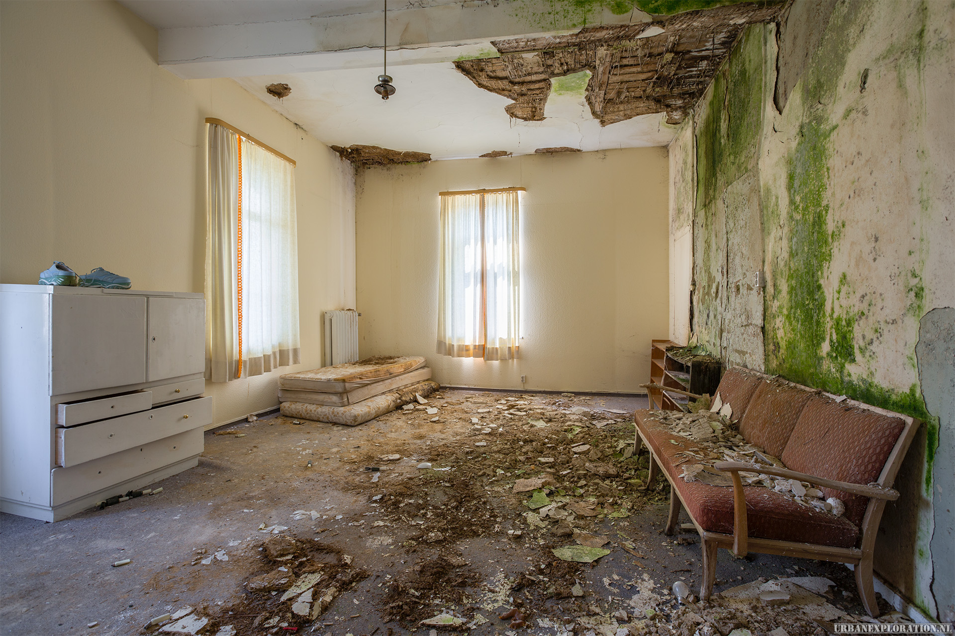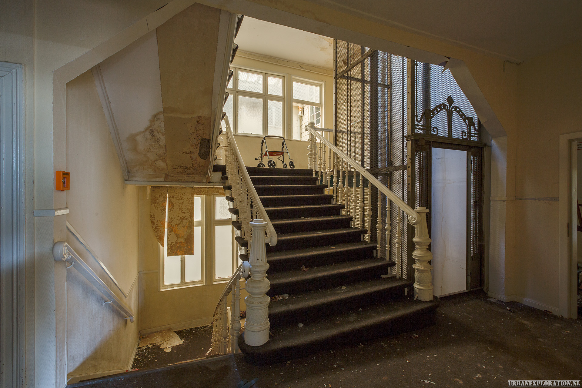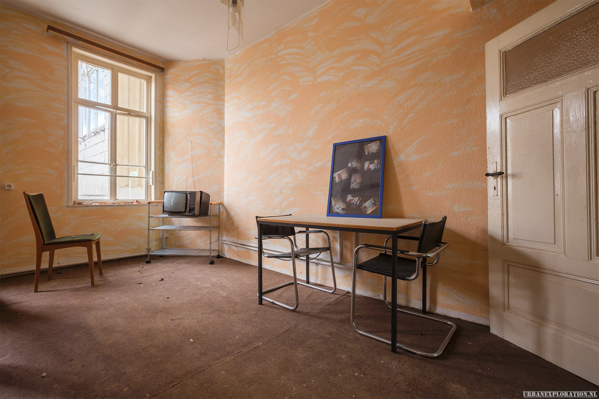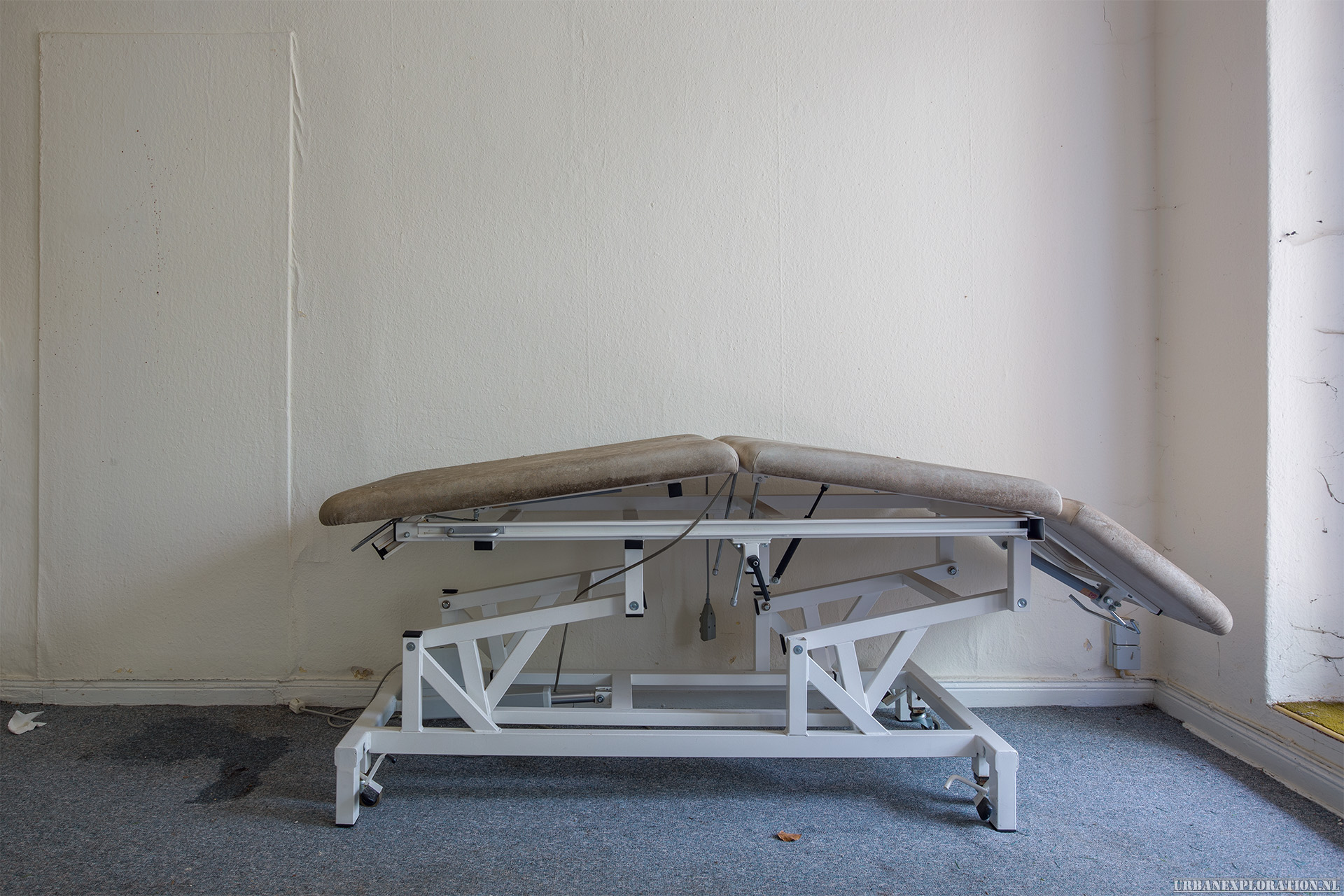 This is the Old University for Physiotherapy. The building got abandoned when the school moved to a more modern accommodation. The lack of maintenance, and a leaking roof made this school a dangerous place to visit. The wooden floors are rotten.