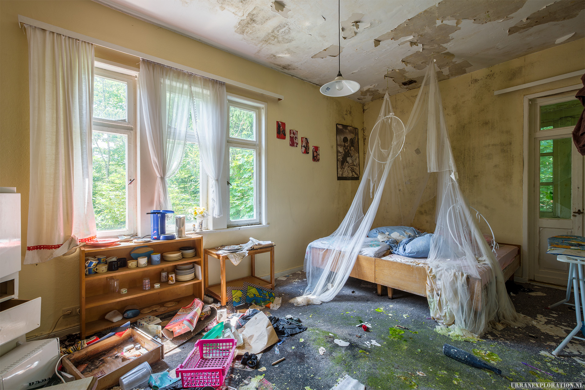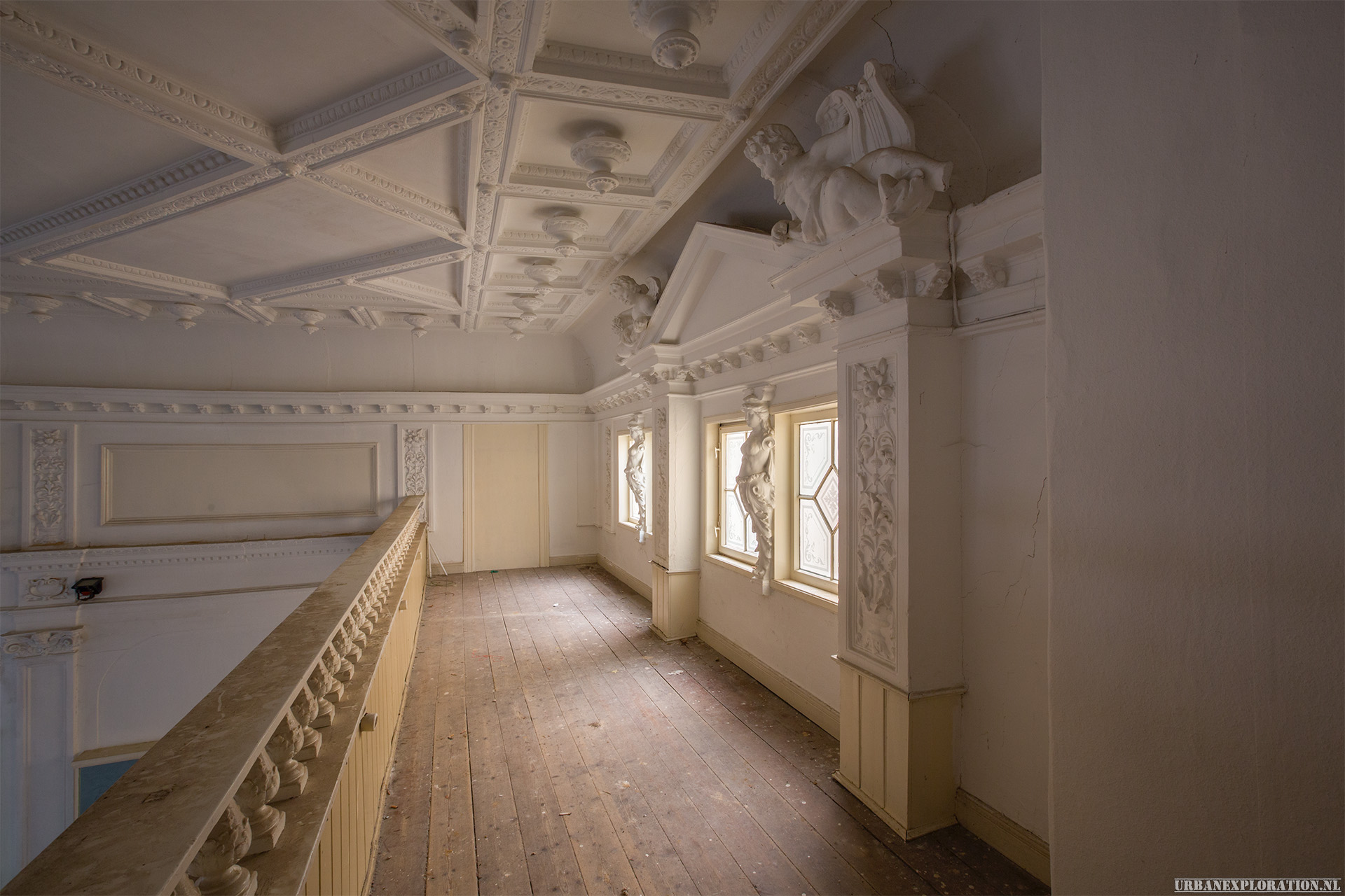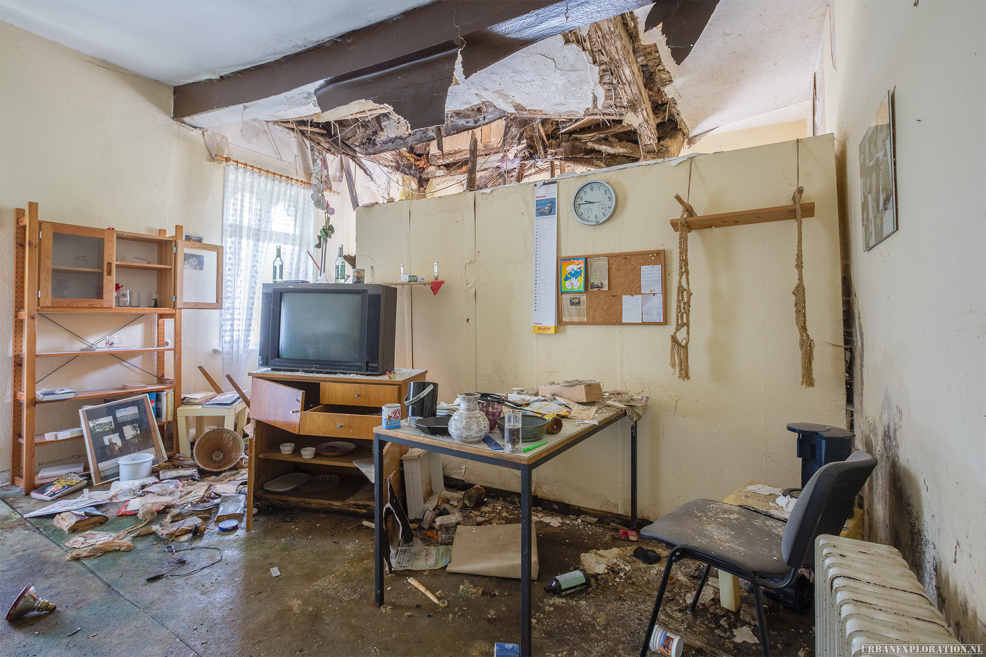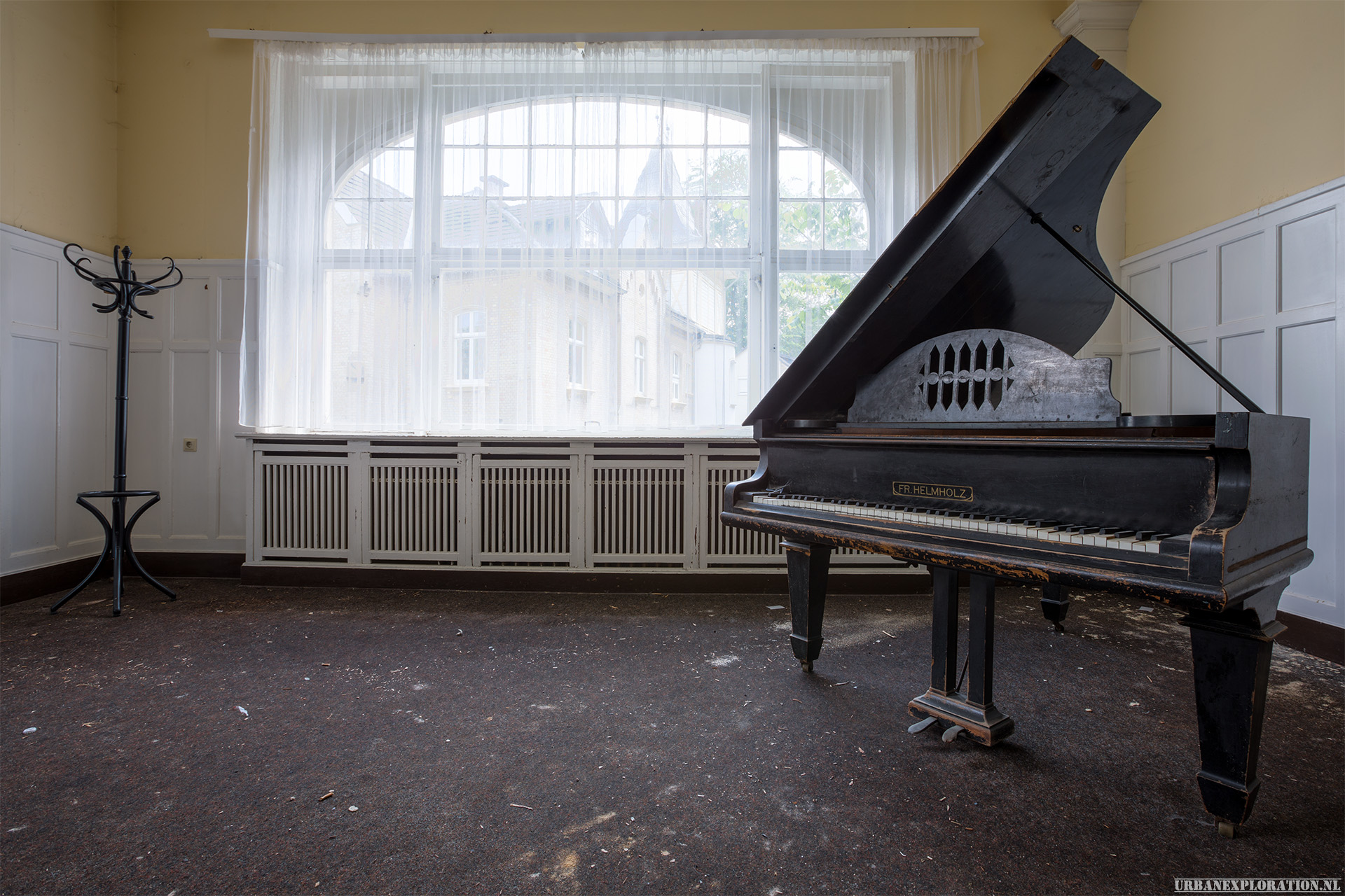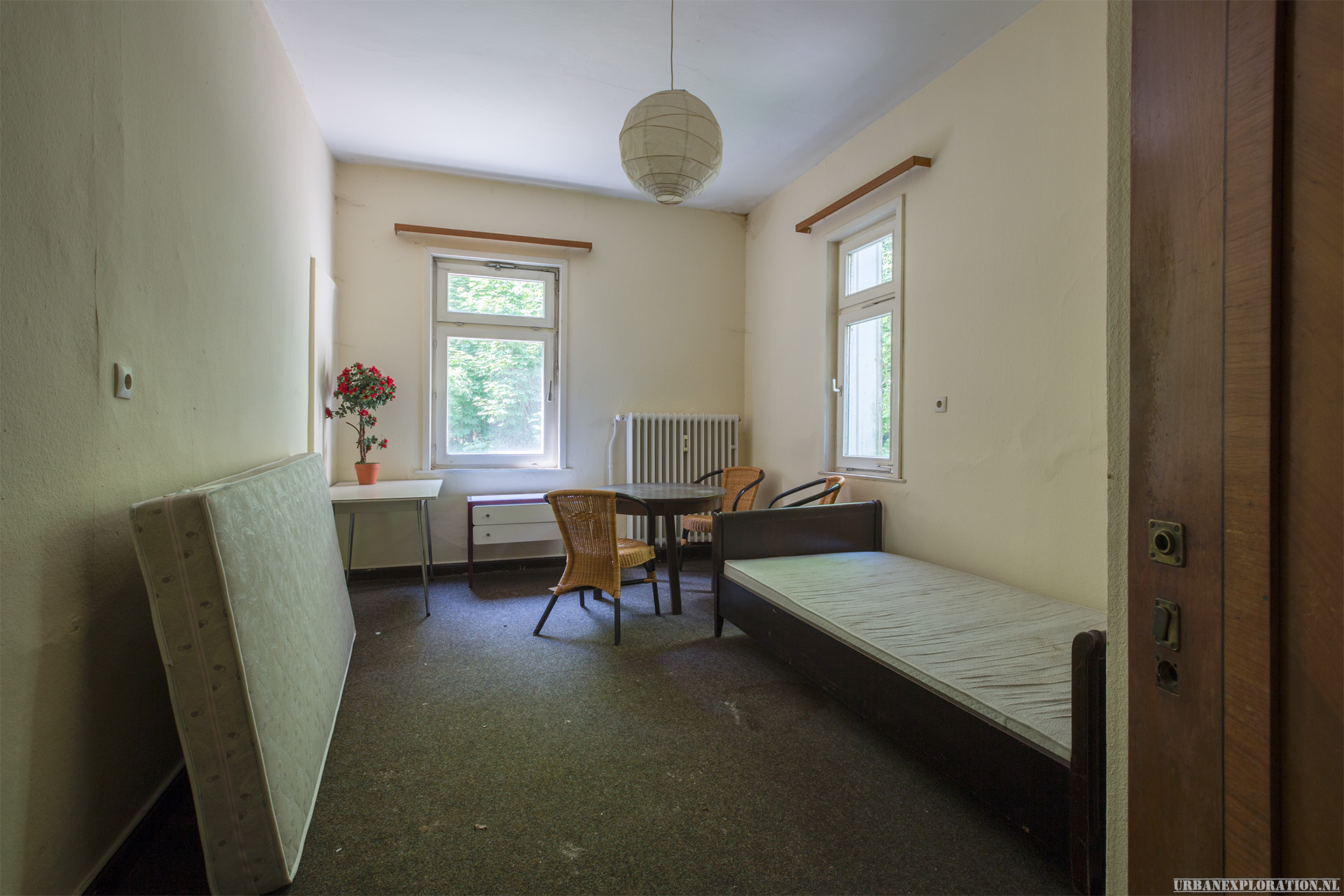 This is the Old University for Physiotherapy. The building got abandoned when the school moved to a more modern accommodation. The lack of maintenance, and a leaking roof made this school a dangerous place to visit. The wooden floors are rotten.