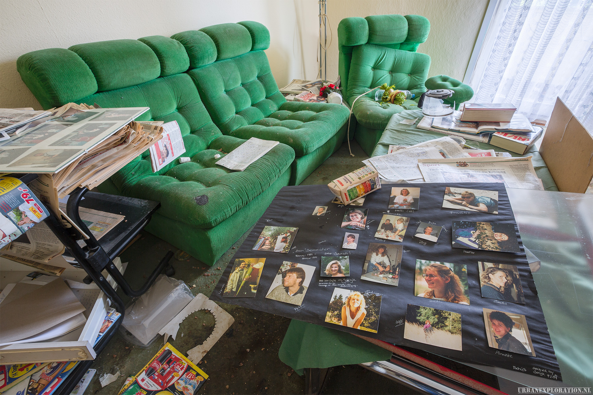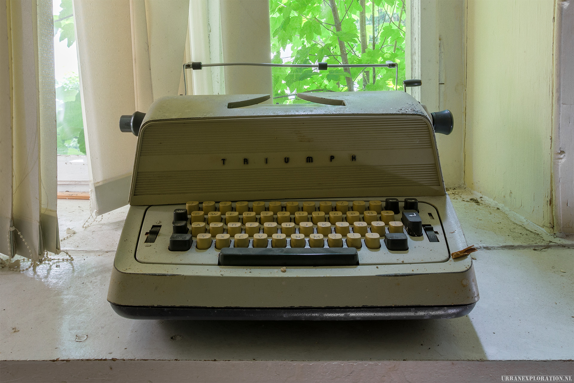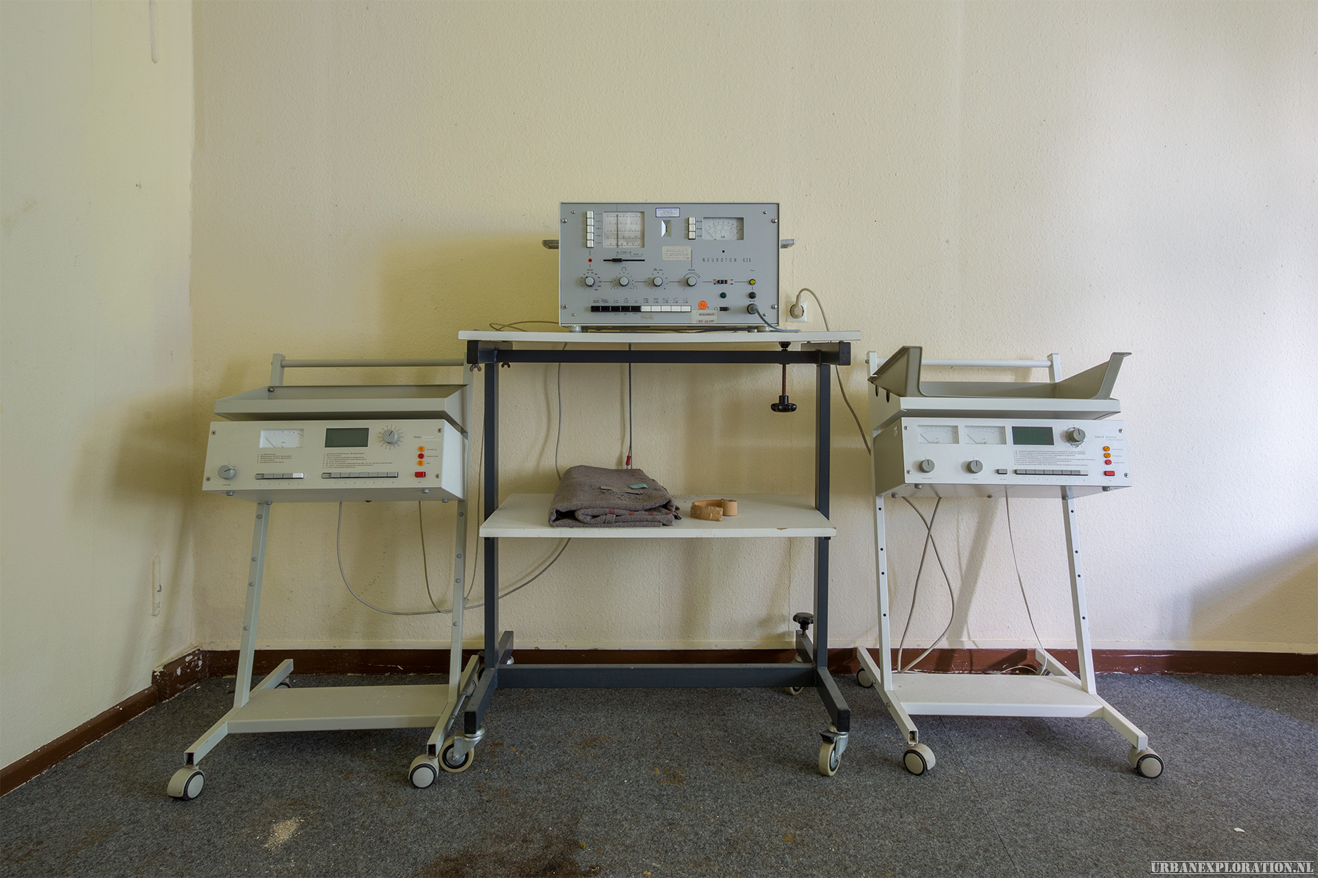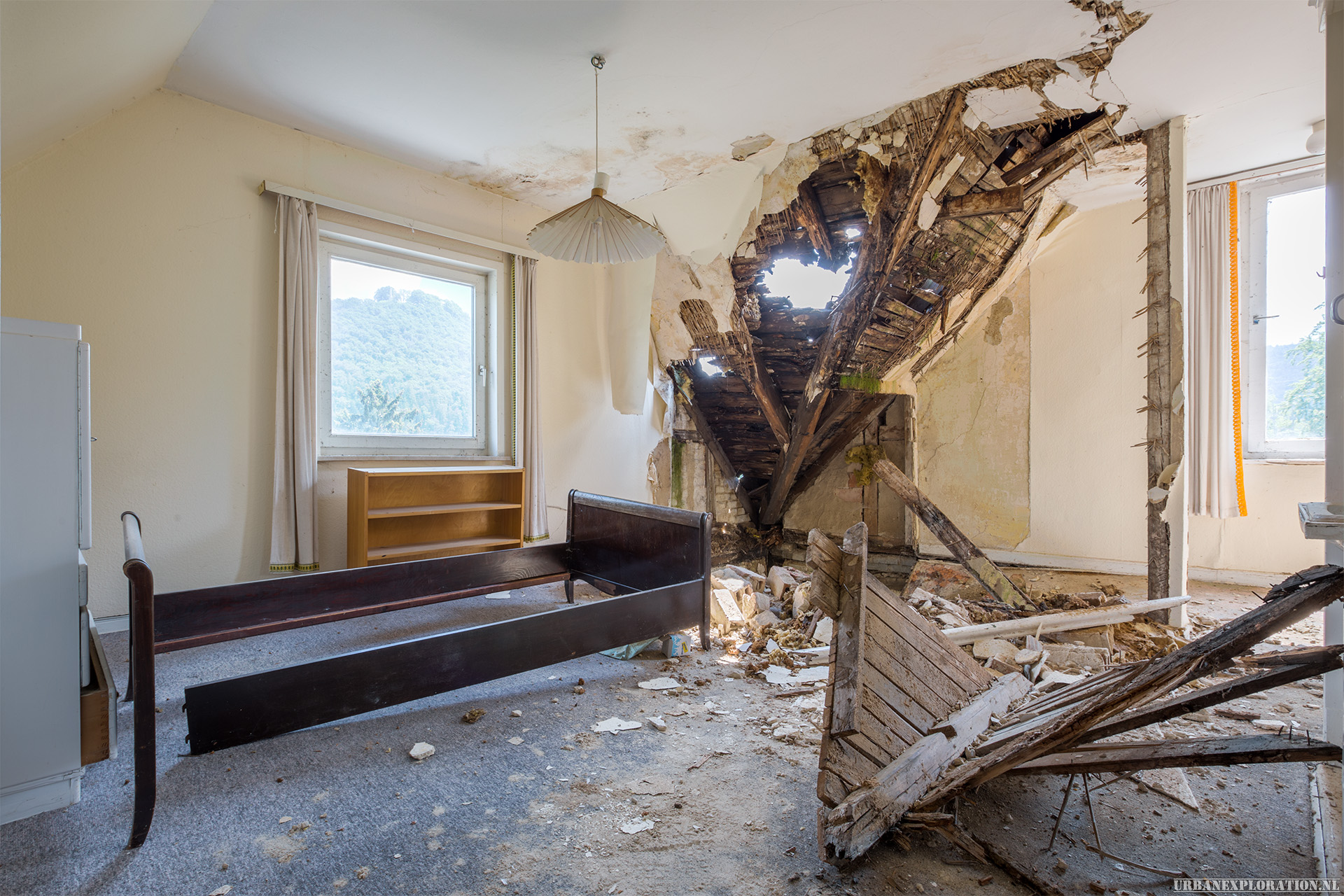 This is the Old University for Physiotherapy. The building got abandoned when the school moved to a more modern accommodation. The lack of maintenance, and a leaking roof made this school a dangerous place to visit. The wooden floors are rotten.