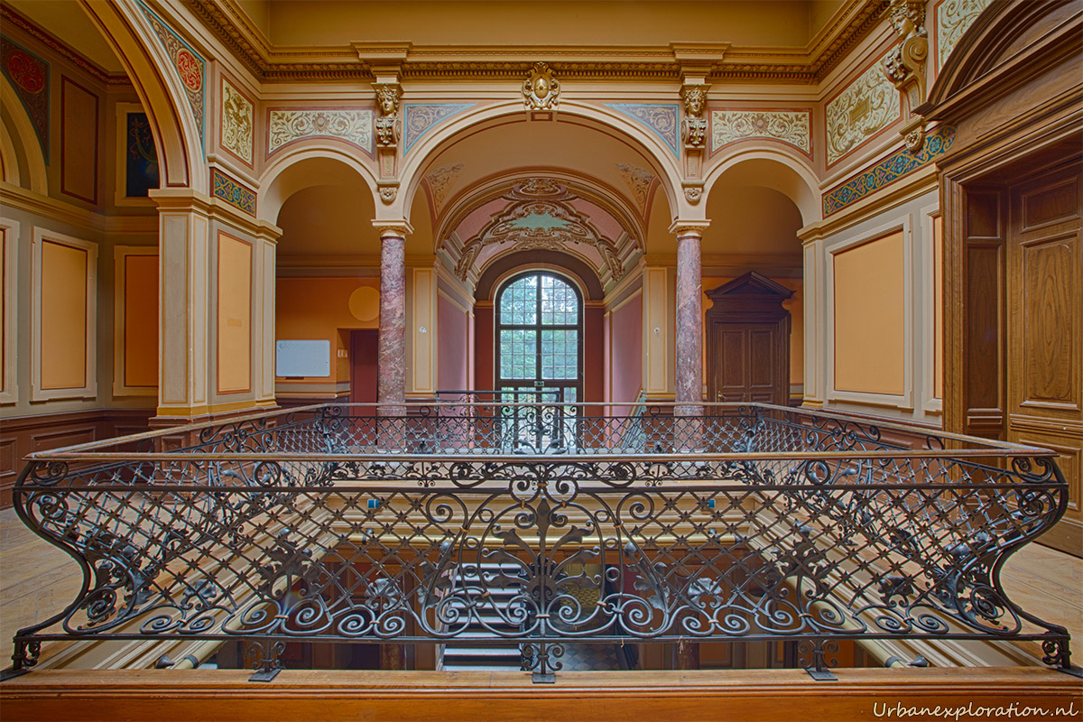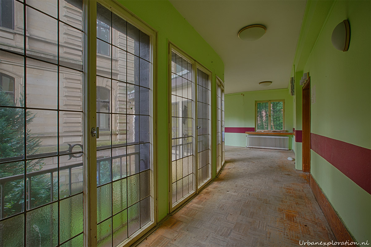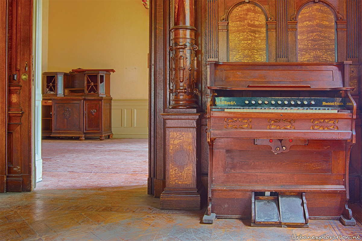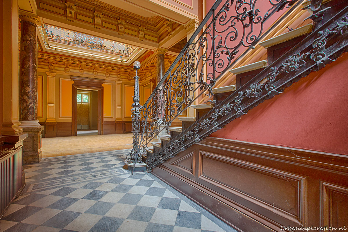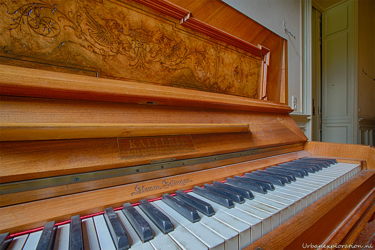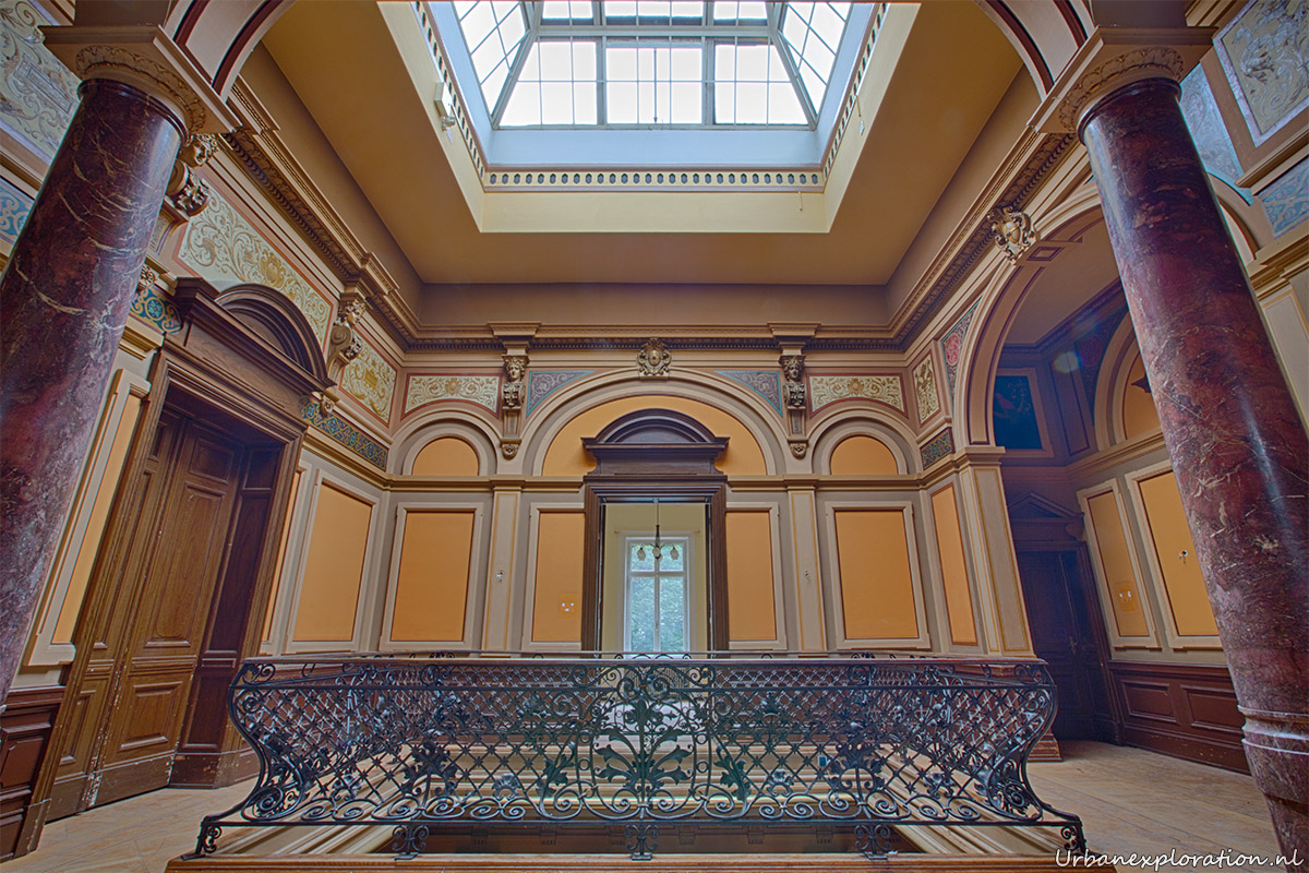 This abandoned grand neo-renaissance styled Mansion was originally a residential dwelling but from the mid 1980’s became a care facility and later a retirement home for the elderly and was linked to the nearby church organisations. Villa Woodstock, as this place is most commonly known, was apparently set for demolition before a private investor stepped in to repurpose the old building. I was unable to find much information about the original owners of the property but it was clear from our visit that the majority of the features of the building have been left in-situ with the bulk of the care facilities being added at the rear of the property in much more modern extensions. Inside there is a spacious entrance hallway which leads on to a 2 story skylight topped hallway which is surrounded with a gallery decorated with wrought-iron handrails. The original serving cabinets were still there and in excellent condition. The adjoining room had an old upright piano, of which I am unsure as to whether this was added by the investor who converted the place or another original feature.